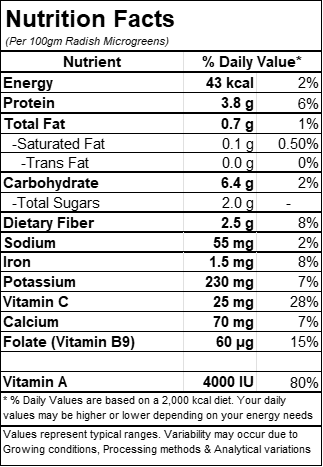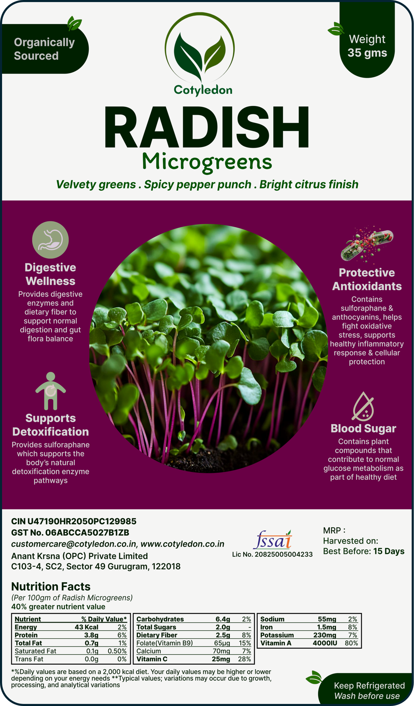 Radish microgreens contain high levels of antioxidants (Rich in polyphenols and glucosinolates), which help combat oxidative stress and reduce the risk of chronic diseases like heart disease and cancer