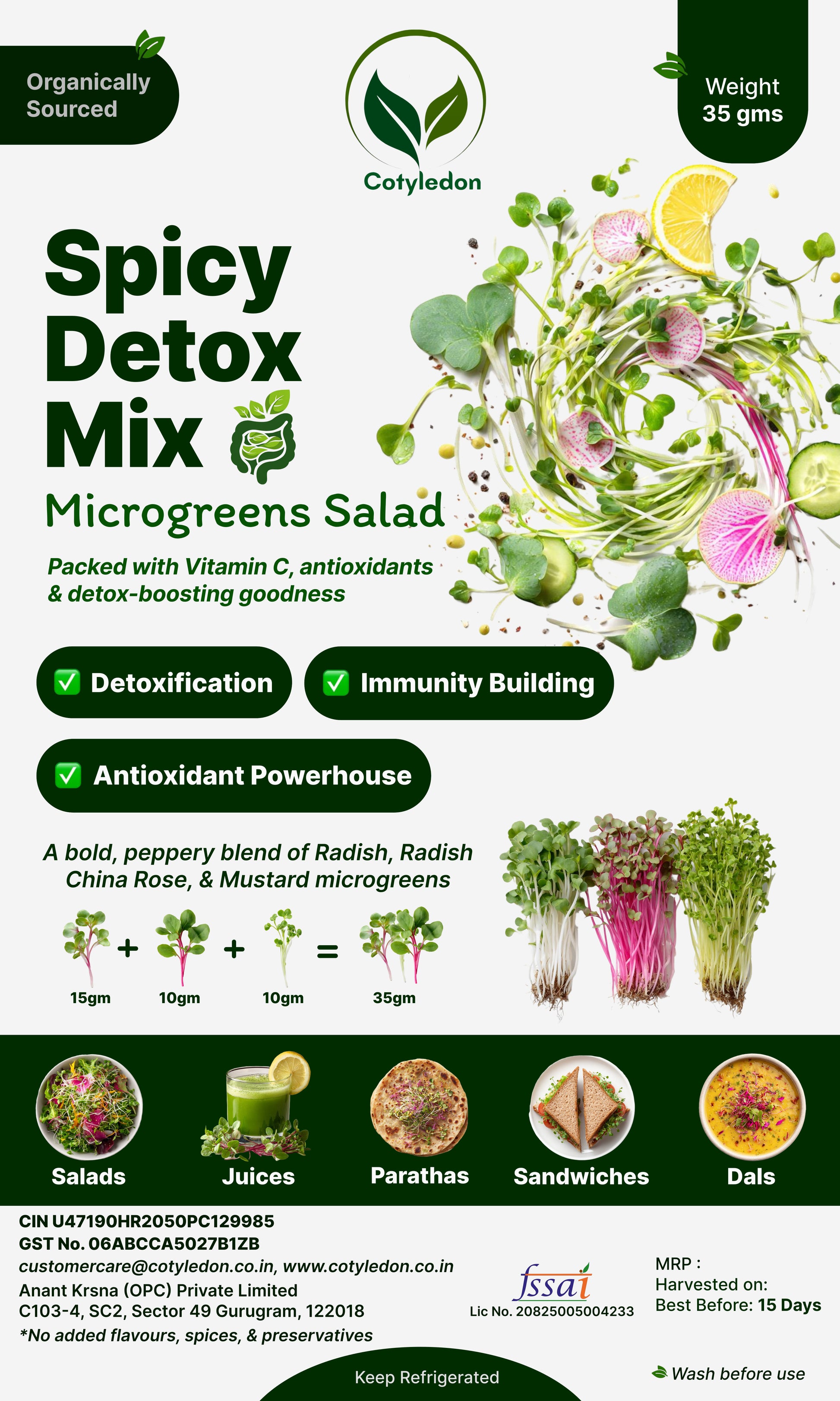 A bold, peppery blend of Mustard, Radish & Radish China Rose microgreens.